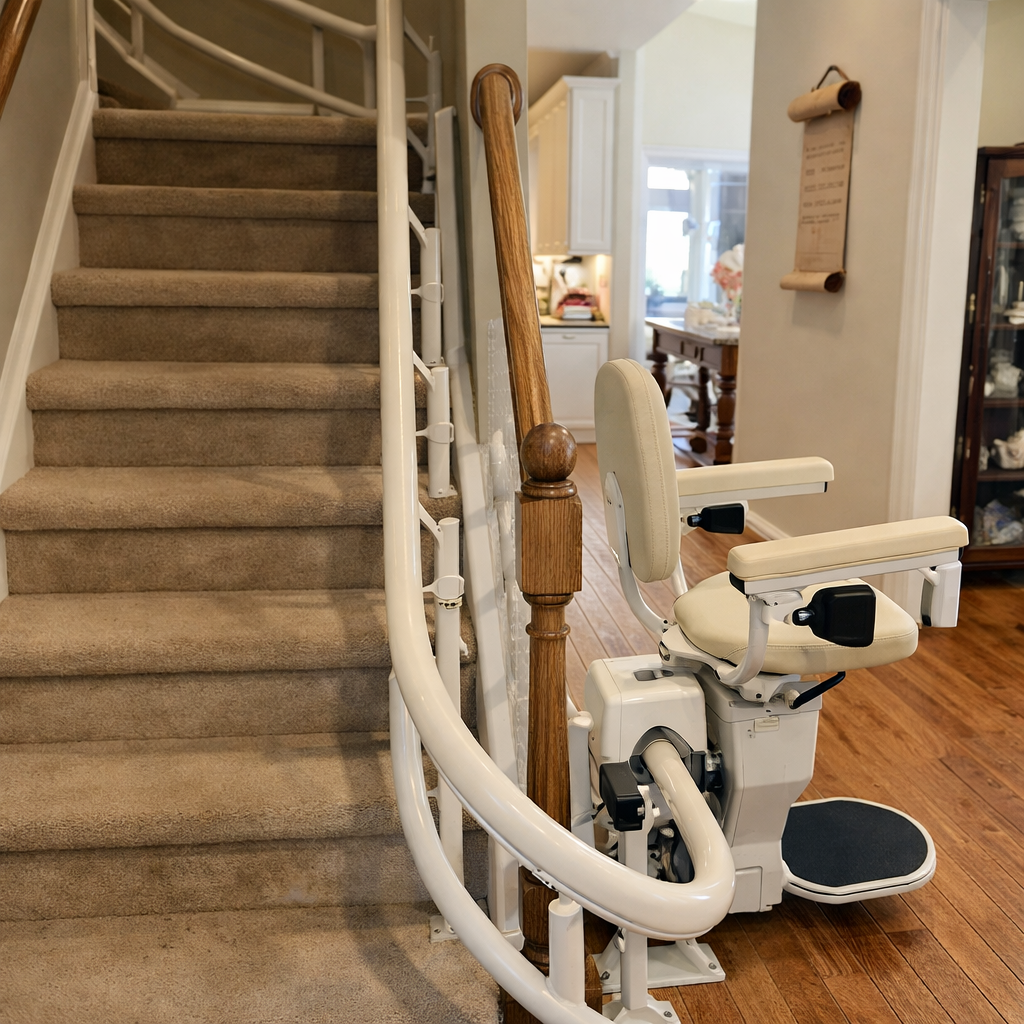 The Rave Curved HD Stair Lift is a custom-built, American-made solution designed to fit your exact staircase, décor, and accessibility needs. Precision-measured with digital camera technology and crafted with durable steel and true curved rails, it delivers an exceptionally smooth, quiet ride—even on 90°, 180°, spiral, and multi-story staircases. With a supportive swivel seat, flip-up arms, and optional custom colors and fabrics, the Rave Curved HD combines comfort, safety, and style for seamless independence on every level of your home.